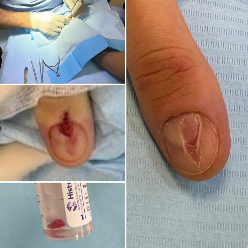 Fibroma to łagodny guz tkanki łącznej, który może rozwijać się w obrębie palców stóp i powodować ucisk na sąsiadujące struktury. Zabieg polega na całkowitym wycięciu zmiany w sposób oszczędzający otaczające tkanki i płytkę paznokciową. Zabieg trwa zwykle około 30–40 minut.